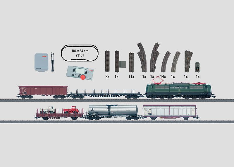 Modelo en miniatura: Locomotora con decoder digital mfx, accionamiento regulado de alta potencia, alumbrado gobernable y generador de ruidos con varias funciones. 1 vagón de techo enrrollable, 1 vagón de paredes deslizantes, 1 vagón cisterna para aceite mineral y 1 vagón de teleros. Longitud de tren: 113,2 cm. 2 modelos en miniatura Unimog diferentes. Contenido: 14 vías curvas 24130, 8 vías rectas 24188, 11 vías rectas 24172, 1 vía de conexión de la alimentación 24088, 1 par de desvíos en curva 24671 y 24672, 1 desvío a la derecha 24612, 1 desvío en curva 24224 y un juego de topes fijos 24977. Transformador de 230 V/60 VA. Mobile Station. Caja de conexión de la alimentación. Manual de juegos ilustrado con numerosos consejos y sugerencias. Opciones de ampliación con las cajas complementarias de vías C y con todo el programa de vías C.