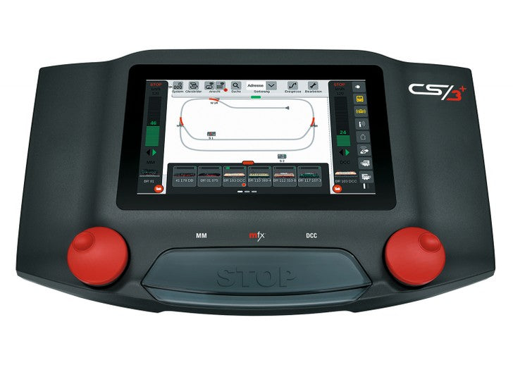 Moderna pantalla táctil en color de alta resolución. Pupitre de mando con esquema de vías central integrado. Carcasa con tecla de parada central y 2 mandos giratorios en calidad industrial robusta. Hasta 32 funciones de locomotora gobernables. 2 lectores de tarjetas de locomotora integrados.